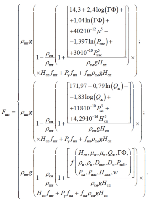 где ρшт – плотность материала штанг кг/м3; ρсм – средняя плотность смеси по длине скважины, кг/м3; fшт, fпл – площадь поперечного сечения тела штанг и плунжера соответственно, м2; Pу – устьевое давление, Па; Hсн – глубина спуска насоса, м.