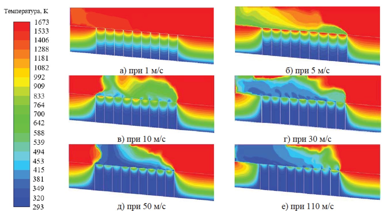 Необходимая скорость подачи метана составляет 5 м/с (рис. 9, б), в данном случае наблюдается допустимая температура метана на выходе из канала, которая не превышает 480 °С, что обеспечивает безопасную работу перфорированного пода. На расстоянии 60 мм и более температура углеродводородной смеси лежит выше 1000 °С, таким образом углеродводородная смесь образуется непосредственно в расплаве, обеспечивая восстановительные процессы с наибольшей эффективностью.