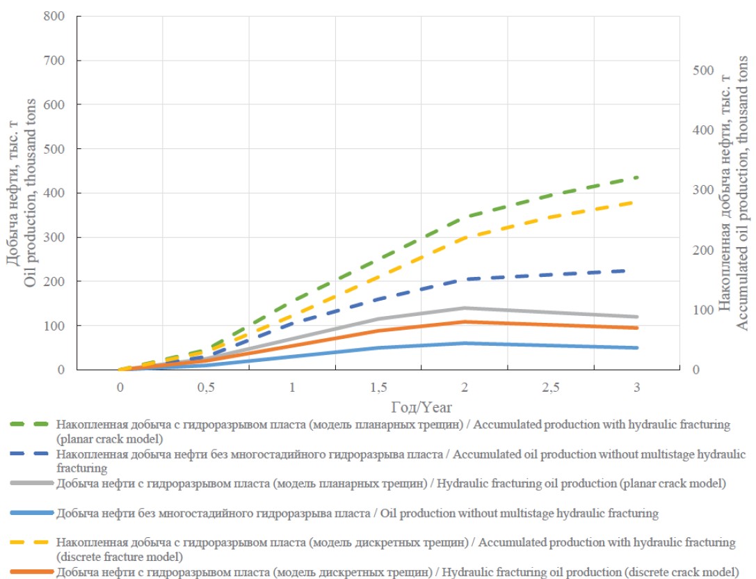 Как видно из рис. 1, уровни добычи нефти при использовании модели планарных систем трещин и модели DFN находятся на сопоставимом уровне, что подтверждает эффективность обоих подходов для моделирования ГРП.