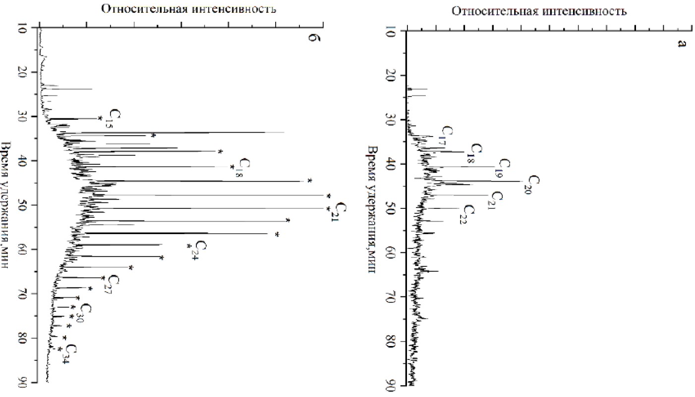 в составе масел мазута идентифицированы н-алканы, н-алкилциклогексаны, гопаны, стераны, н-алкилбензолы, н-алкилметилбензолы, алкилнафталины и алкилфенантрены. Отсутствие в составе насыщенных углеводородов низкомолекулярных гомологов частично может быть связано с термическим разрушением слабых ковалентных связей в структуре высокомолекулярных компонентов нефти и, как следствие, с отщеплением низкомолекулярных фрагментов, которые переходят в масла, получаемые при ее первичной перегонке.