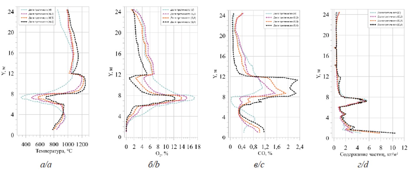 Существенное снижение CO в данном варианте обусловлено вводом большого количества воздуха с высокой проникающей способностью в область с высокими температурами. На выходе из топочной камеры концентрация CO незначительна во всех исследованных вариантах, свидетельствуя о том, что изменение соотношения долей вторичного и третичного воздуха не оказывает существенного влияния на увеличение потерь с недожогом CO, что согласуется с работами [27, 28].