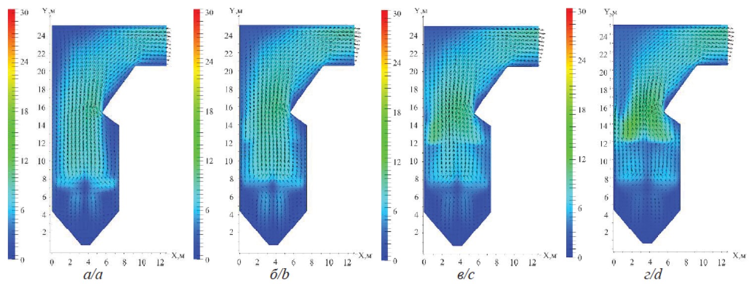Рис. 2. Распределение скоростей (м/с) в продольном сечении топочной камеры: а) базовая компоновка; б) доля третичного дутья 0,2; в) доля третичного дутья 0,3; г) доля третичного дутья 0,4