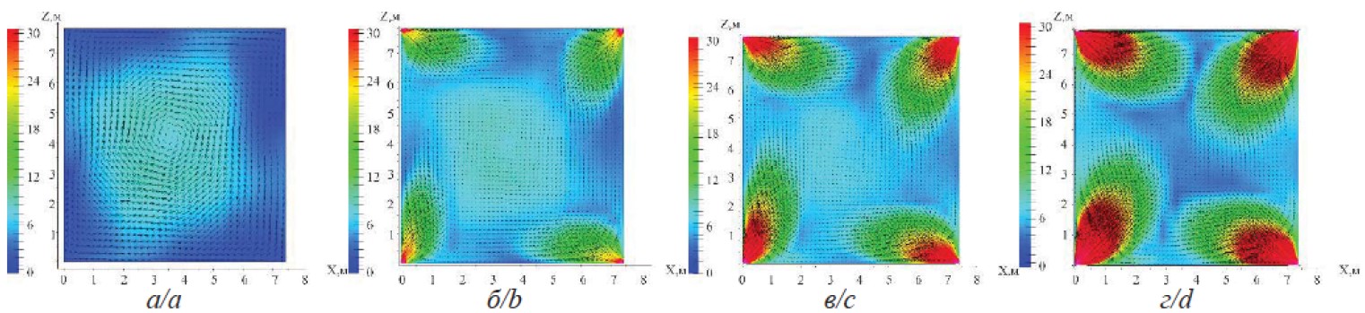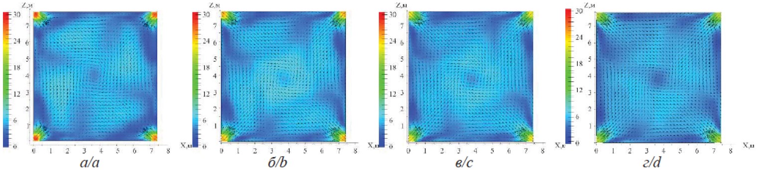 На рис. 4 представлены результаты численных расчетов в горизонтальном сечении топочной камеры на отметке установки сопел третичного дутья. В базовом варианте (без сопел) наблюдается закрученный поток относительно центральной оси топки в соответствии с формированием потока горелочными устройствами (рис. 4, а). Наличие сопел третичного дутья выше горелочных устройств с противоположным направлением воздушных струй к условной окружности не приводят к изменению направления вращения вертикального вихря (рис. 4). Увеличение доли третичного дутья приводит к снижению скоростей потоков на выходе из горелочных устройств и, соответственно, к снижению взаимопроникновения и интенсивности смешения горелочных струй (рис. 3). Воздушные струи от сопел третичного дутья с ростом их расходов более интенсивно проникают вглубь топочного объема, активно заполняя его.