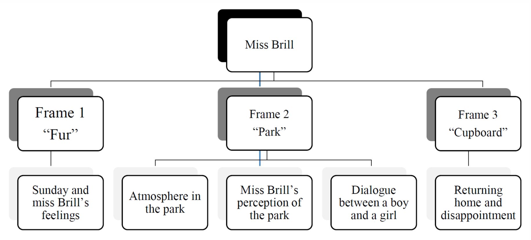 Обсуждение результатов. Рассмотрим концептуальную значимость фреймового анализа на примере рассказа К. Мэнсфилд “Miss Brill” (Mansfield 1922: 182-189), повествующем о жизни женщины по имени Мисс Брилл, которая проводит свои воскресные дни на скамейке в парке, наблюдая за людьми и воображая их жизни. Она носит старую лисью горжетку, которую рассматривает как своеобразный театральный атрибут, помогающий ей ощущать себя особенной и значимой. Этот рассказ можно условно разделить на три ситуации, представленные тремя фреймами: “Fur”, “Park-Theatre” и “Disappointment”, которые состоят из слотов.