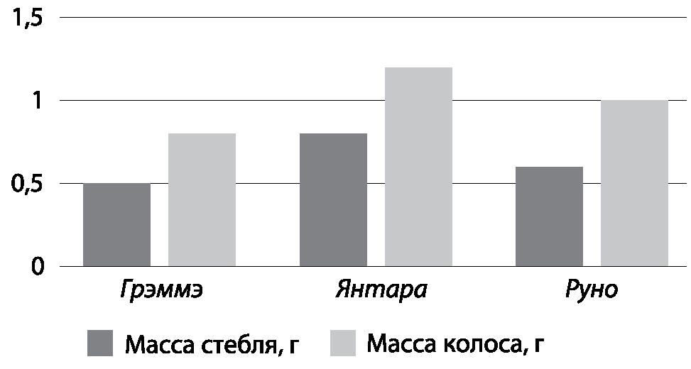 На рисунке 2 прослеживается увеличение массы стебля и колоса у Янтары, по сравнению с другими сортами.