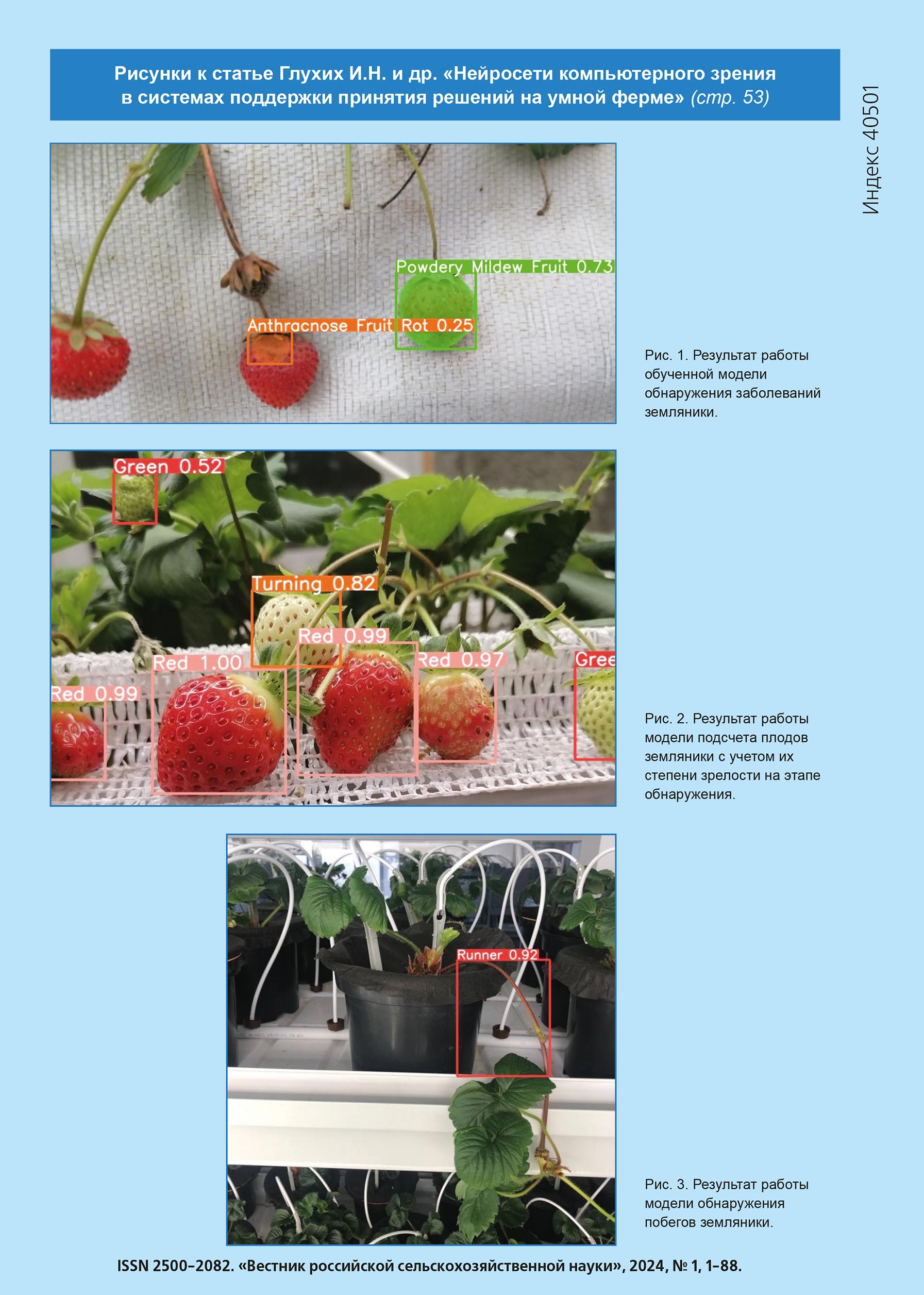 На рисунке 1 (4-я стр. обл.) представлен результат работы обученной модели обнаружения заболеваний земляники. Видно, что модель не только выявляет заболевание, но и выделяет его рамкой. При этом выводится название заданного класса болезни и число, которое может трактоваться, как величина относительной (по сравнению с другими классами) степени уверенности модели в предложенном выводе. Нейросеть выдает то название, которое получило наибольшую степень уверенности.