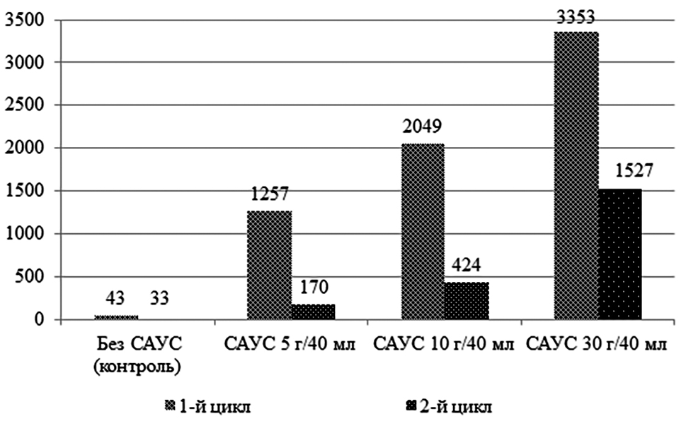 В пределах одной условной дозы ПУУС между циклами различия по содержанию нитратов в почве составили: в 7,4 раза для 5 г / 40 мл; в 4,8 – 10 г / 40 мл, в 2,2 – 30 г/40 мл, то есть с ее увеличением возрастает остаточное количество нитратов. В указанном выше ряду запасы составили 14% (170/257), 21 и 46%.