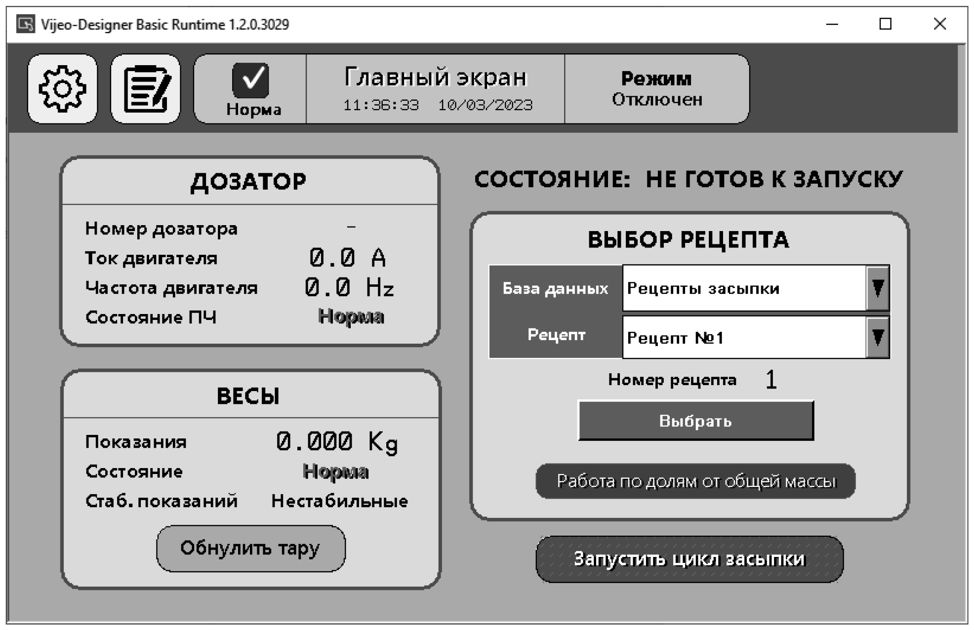 Предлагаемая программа разработана для ПЛК TM241C24R на языке программирования Structured Text (ST), одном из языков стандарта IEC61131-3, в среде EcoStruxure Machine Expert. [16] Управление выведено на жидкокристаллический дисплей. На главном экране отображаются: параметры электродвигателя, рецепт и показания взвешивающих датчиков (рис. 1).