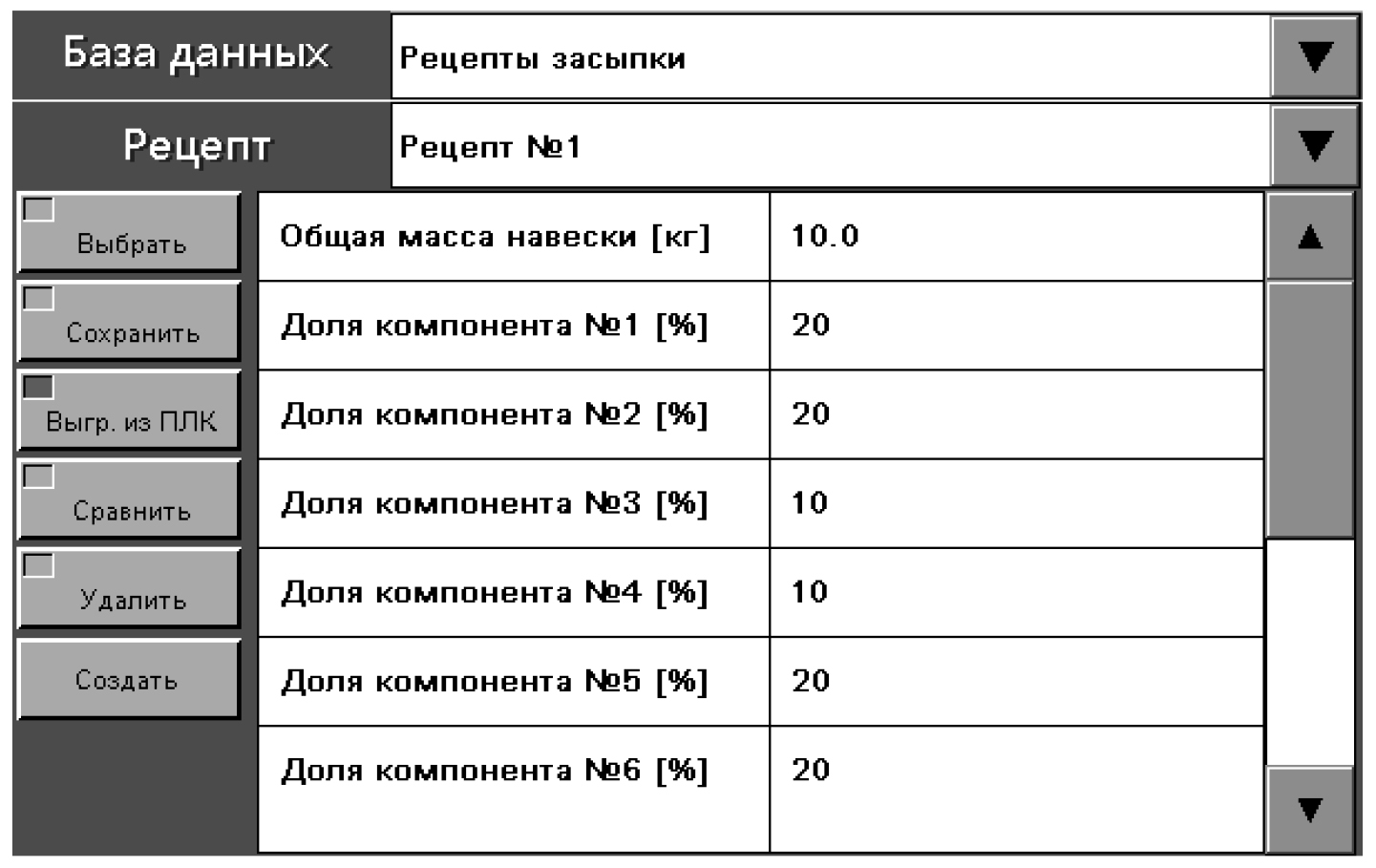 В автоматическом режиме работой дозаторов управляет программа, включая и отключая дозатор, изменяя частоту вращения вала рабочего органа. В данном режиме каждый дозатор подает только один компонент. При этом предварительно вводят данные, характеризующие работу дозаторов. В меню выбора рецептов указываются общая масса навески, доля компонентов в ней (кг или %) (рис. 2).