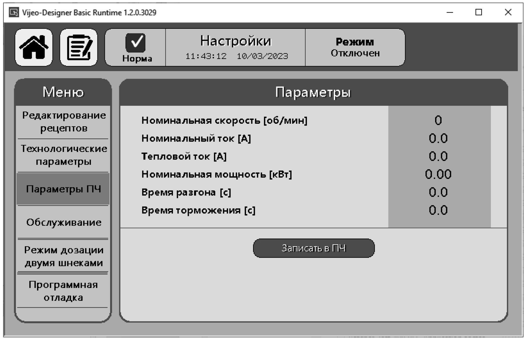 В меню выбора технологических параметров: частота вращения вала дозатора – основная и в режиме досыпки; переключение частоты вращения вала с основной на частоту вращения досыпки; масса, при которой останавливается дозатор (рис. 3). Дополнительно вводят параметры работы частотного преобразователя, управляющего электродвигателем: номинальный и тепловой ток двигателя, его номинальная мощность, частота вращения вала, время разгона и торможения (рис. 4).