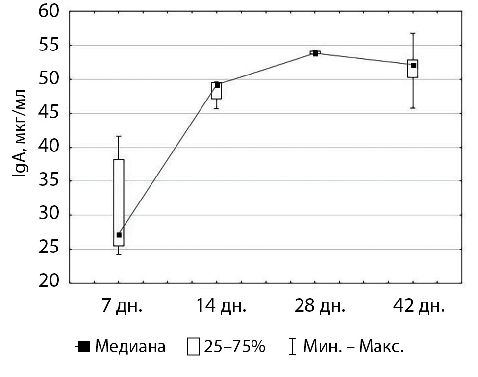 Рис. 7. Динамика изменения уровня IgА в сыворотке крови здоровых цыплят-бройлеров в зависимости от возраста, мкг/мл.