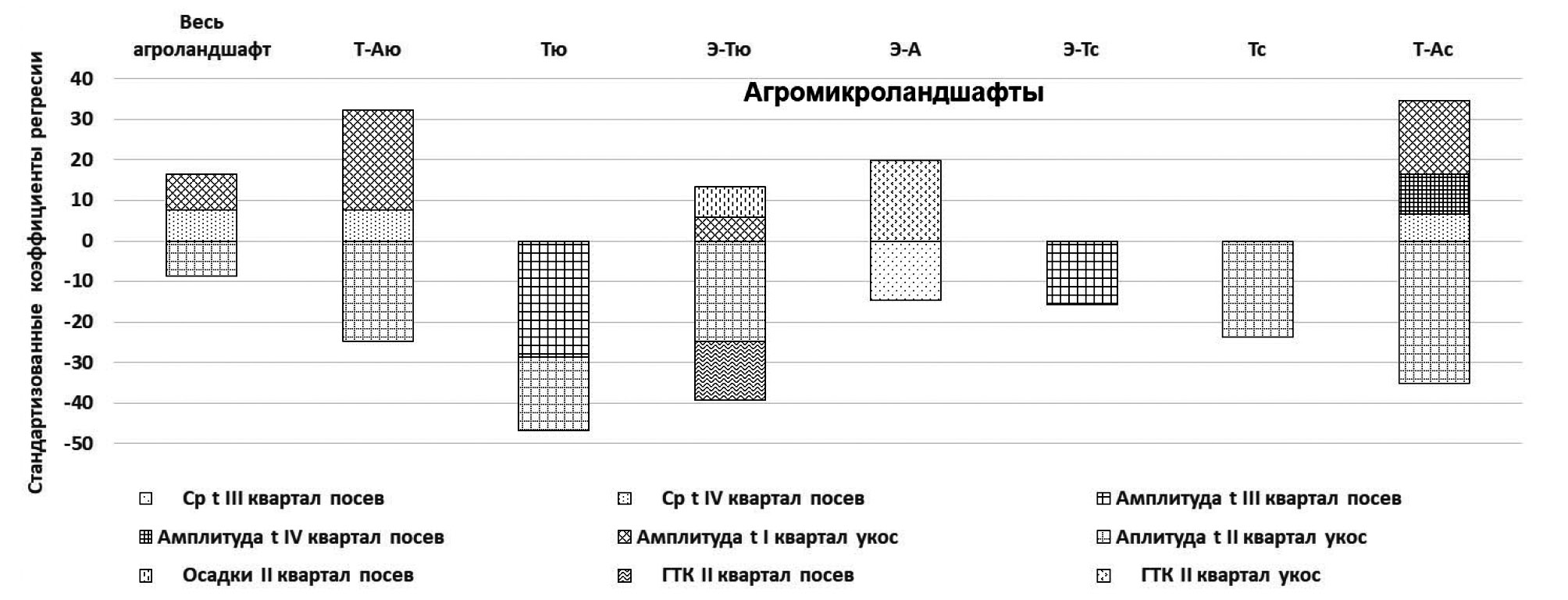 На урожай трав действует вариабельность условий произрастания не только во времени, но и в пространстве. Негативное влияние на урожай значительных перепадов температур воздуха в течение месяца отмечается во всех агромикроландшафтах, кроме плоской вершины, где он положительно реагирует на рост ГТК и отрицательно на увеличение температур воздуха предукосого периода.