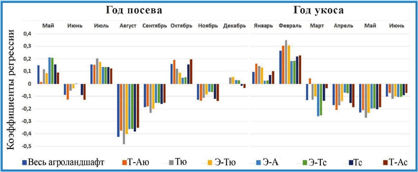 Характер коэффициентов уравнения регрессии, рассчитанного для всего агроландшафта конечно-моренной гряды, показывает, что урожайность трав возрастает при увеличении амплитуд температур в январе–марте и средней температуры воздуха в октябре–декабре года посева. Относительно теплые позднеосенние и раннезимние месяцы позволяют травостою лучше подготовиться к перезимовке, а оттепели в середине зимы и начале весны пополняют запасы почвенной влаги, все это приводит к росту урожайности трав. Значительные перепады температуры весной и ранним летом снижают урожай сена, по-видимому, из-за ускорения цветения трав и формирования генеративных органов в ущерб вегетативным.