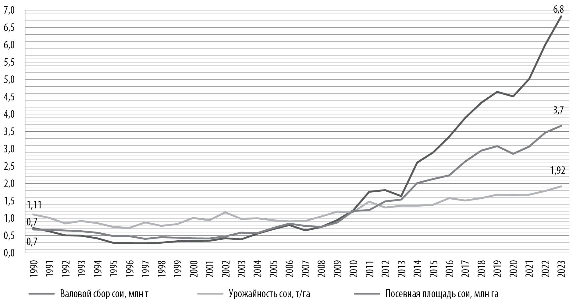 Вслед за ростом посевных площадей сои происходит увеличение общих объемов производства культуры. Суммарно в Российской Федерации в 2023 году сбор сои превысил 6,8 млн т – рекорд за всю историю отечественного соеводства. Рост ее объема в стране происходит в результате экстенсивного развития (увеличение площади) и интенсивного (использование новых высокоурожайных отечественных сортов). Очевидно, что расширение посевных площадей из-за высокого спроса на сою идет гораздо быстрее, чем повышение качества, выраженного в продуктивности (рис. 3).