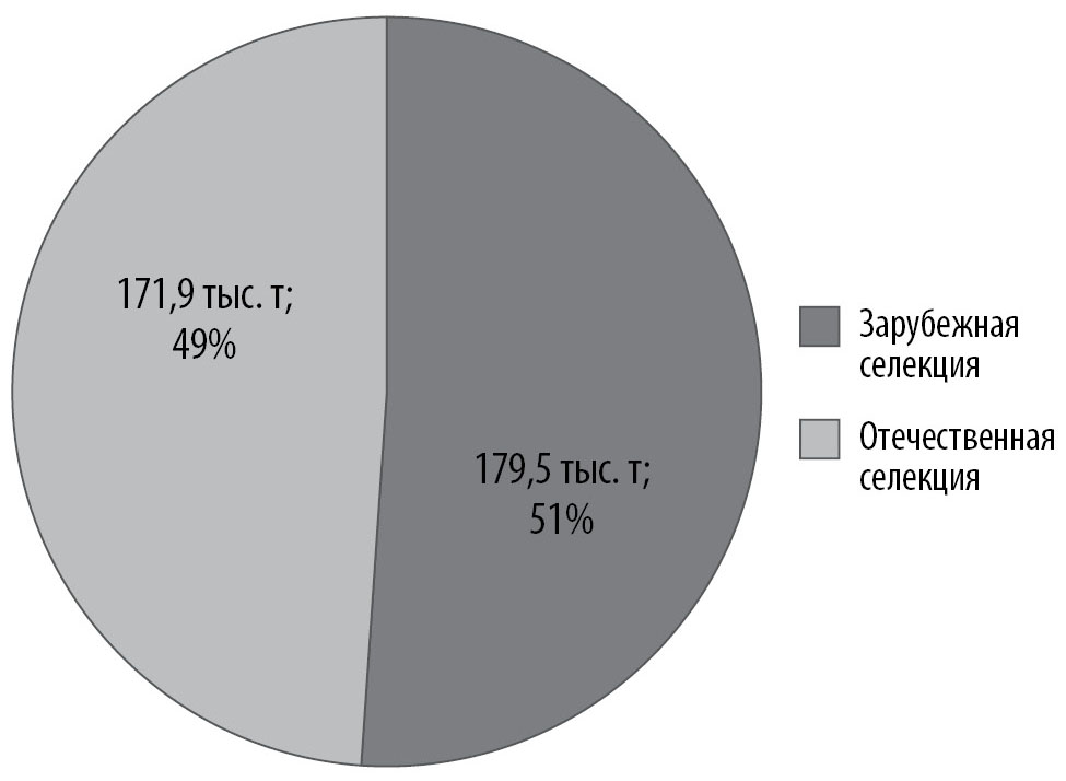 На территории России возделывают 224 сорта сои, из них 67 зарубежной селекции. Несмотря на то, что количественно по наименованиям зарубежная селекция в меньшинстве, в объеме высеваемых семян она преобладает, составляя 51 % (рис. 4). Суммарный высев семян сои в 2022 году – 351,4 тыс. т. Ситуация с данной пропорцией по семенам меняется незначительно от года к году, в 2017 на долю отечественных семян приходилось 52 %.