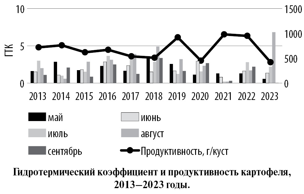 В результате анализа уровня ГТК выявлена связь между влагообеспеченностью и продуктивностью за вегетацию картофеля (см. рисунок). В годы, когда было сильное переувлажнение почвы (ГТК > 2,5) из-за тайфунов и циклонов при активном клубненакоплении (июль-сентябрь), наблюдали снижение продуктивности по причине удушья растений и их гибели (2013–2018, 2020 и 2023 годы).