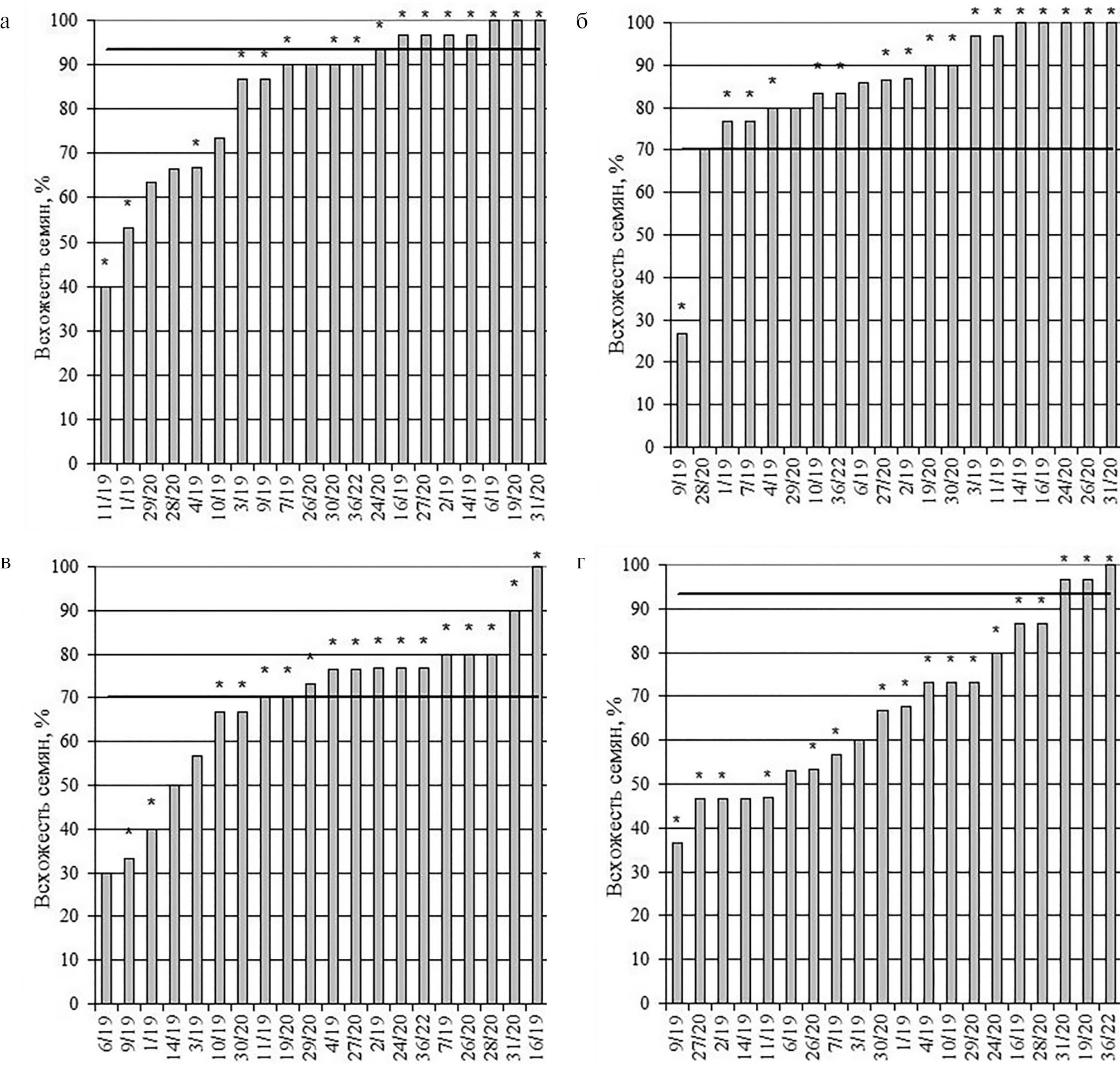 Рис. 1. Лабораторная всхожесть семян томата: а – Санька, б – Волгоградский, в – Космонавт Волков, г – Новичок (x ± SD, n=3, * – значения, достоверно отличающиеся от контроля при р < 0,05, черная линия – контрольный вариант).