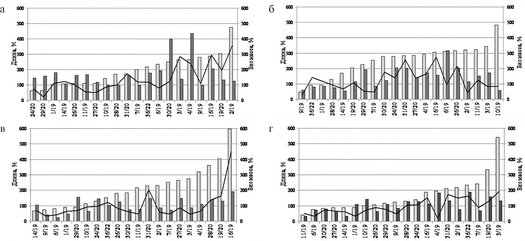 Суспензии изолятов 14/19, 9/19, 6/19, 11/19, 29/20 снижают длину корня на 8…34%, остальные провоцируют его развитие. Рост стебля ингибировали суспензии изолятов 9/19, 6/19, 1/19, 10/19, 30/20, 11/19, 2/19, 7/19, 3/19 на 12,4…76,0%. Понижение общей биомассы проростков на 13,4…64,0% вызывали изоляты 14/19, 29/20, 10/19, 26/20, 30/20, 11/19, 2/19, 27/20, 3/19, 4/19. При этом стимулировали развитие корня суспензии 15 изолятов, стебля – 10, биомассы – 5. Из них максимальное действие (увеличение длины корня на 500%, стебля – 90,2, биомассы – 349,2%) оказывала 16/19 (рис. 2в).
