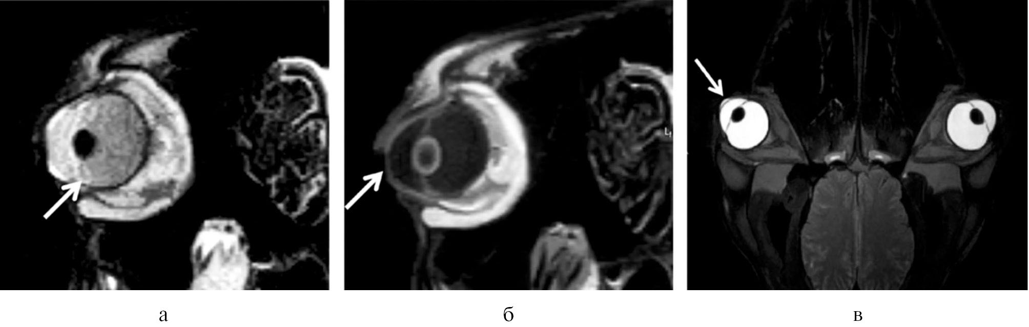 Рис. 2. Магнитно-резонансная томография сканером 0,2 Tesla skanner, Airis Mate с толщиной среза 4 мм: а – аномальное цилиарное тело; б – утолщеная поверхность роговицы; в – гиперинтенсивный карман на утолщенной роговице.