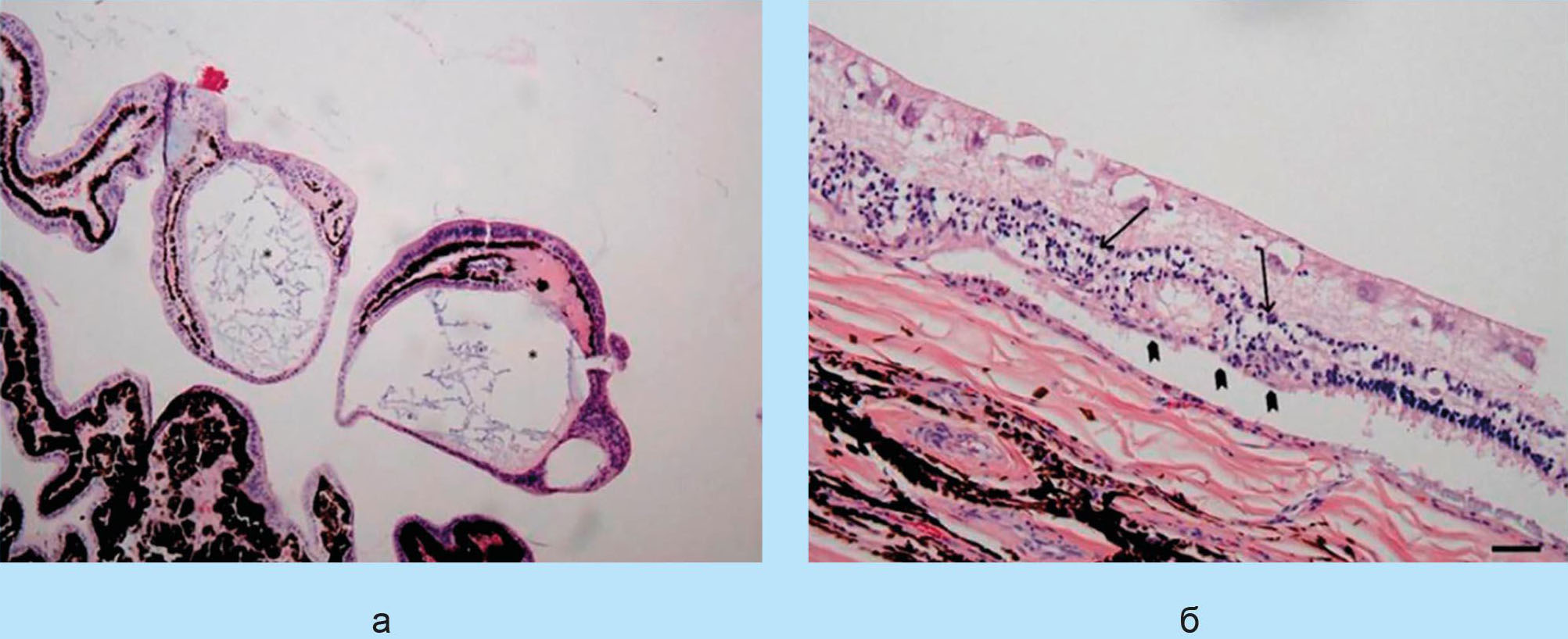 Рис. 3. Гистологическое исследование глазных яблок: а - цилиарные кисты; б - дегенеративные изменения сетчатки.