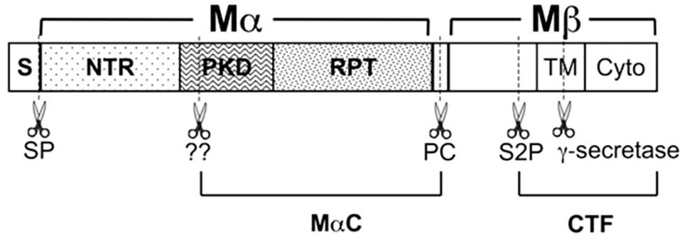 В пределах первичной последовательности указаны сигнальный пептид (S), N-концевая область (NTR), повторяющийся домен поликистозной почки (PKD), домен (RPT), трансмембранный (TM) и цитоплазматический (Cyto). Сигнальный пептид удаляется с N-конца PMEL в ЭР с помощью сигнальной пептидазы (SP). PMEL расщепляется пропротеинконвертазой (PC) с образованием фрагментов Mα и Mβ, которые связаны дисульфидными связями (не показано). Последующее расщепление протеазой сайта 2 (S2P) в сайте, проксимальном к люминальной стороне ТМ, приводит к формированию C-концевого фрагмента (CTF) и высвобождает Mα. Пока еще неопознанные ферменты (отмечены знаком «??») дополнительно расщепляют Mα в пока еще неизвестных сайтах с образованием MαC. Показано, что фрагменты MαC и фрагмент домена PKD накапливаются в фибриллярных меланосомах. [7–9]
