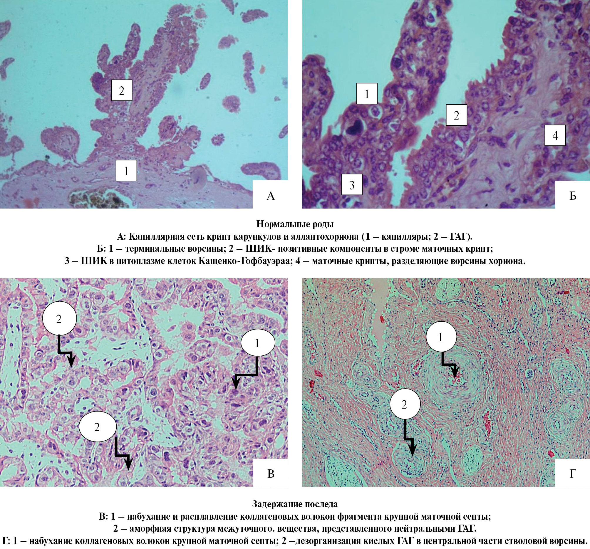 Рис. 1. Структурно-клеточная организация трофобластической выстилки крипт карункулов и аллантохориона ворсин котиледонов в норме и при задержании последа. А, В – ШИК реакция по Мак-Манусу; трихромная окраска по Masson; окраска альциановым синим по Стидмену; Б, Г – окраска гематоксилином и эозин-флоксином; PAS-реакция по Мак-Манусу. Здесь и в рис. 2–5 докраска гематоксилином Майера, общее увеличение × 200.