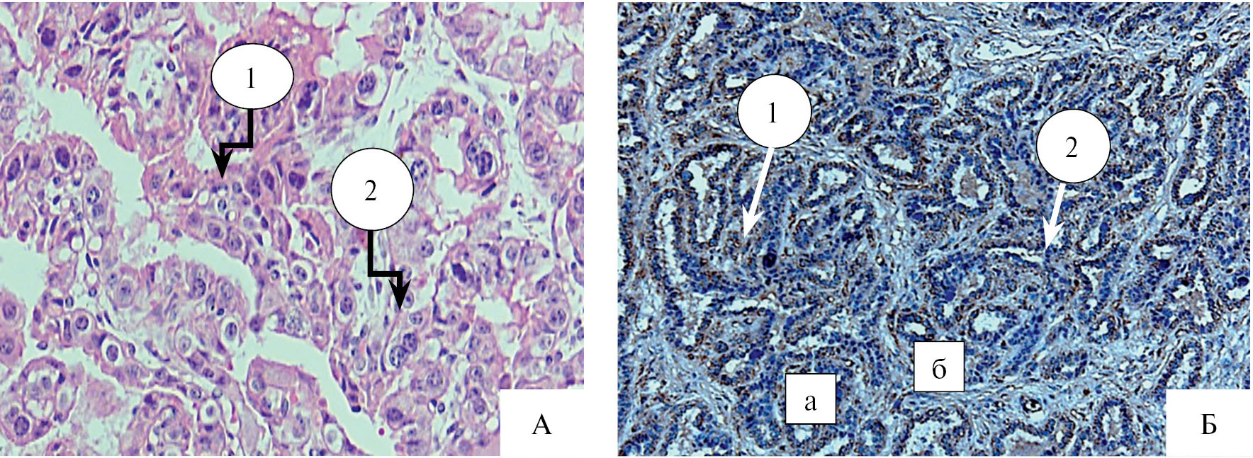 Рис. 2. Иммунолокализация ММР-1 пролиферации клеток «плацентомы» ПАП-метод. А – нормальные роды: 1 – локализация ММР-1 в крипте; 2 – синцитиотрофобласте. Антитела к ММР-1. Б – задержание последа: 1 – локализация ММР-1 в клетках крипт; 2 – пространстве крипт и ворсин. Антитела к ММР-1: а – вакуолярная дистрофия клеток эпителия крипт карункула; б – кровенаполнение сосудов крипты карункула.