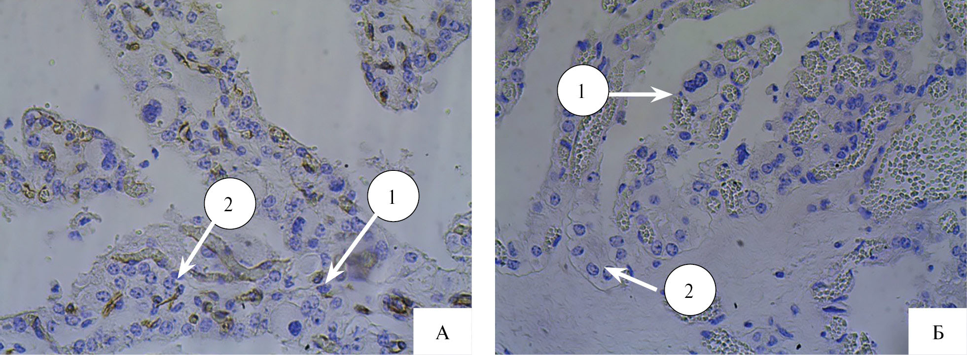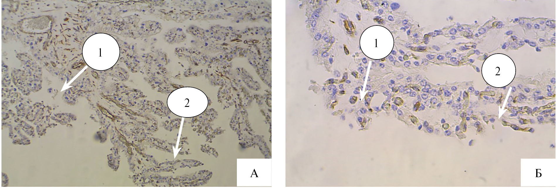 При окраске ворсин аллантохориона по Маллори отмечается диффузное тонкое фибриллярное окрашивание коллагена в составе крипт карункула и выраженное диффузное окрашивание ядерного материала клеточного компонента. Выявляется резкое цитоплазматическое набухание и вакуолизация эпителиальных клеток, субэпителиальный отек соединительной ткани. Иммунолокализация металлопротеиназы матриксной ММР-9 активно проявлялась в цитоплазме синцитиотрофобласта (1) и трофобласта (2), за исключением гигантских двуядерных клеток (рис. 5А). Слабовыраженная реакция MMP-9 отмечалась в цитоплазме эпителиоцитов крипт карункулов материнской части плаценты. Остаточное скопление данного типа металлопротеиназы было зафиксировано в деградируемых криптах (1) материнской части плаценты, а также вокруг сосудов (2) (рис. 5Б).