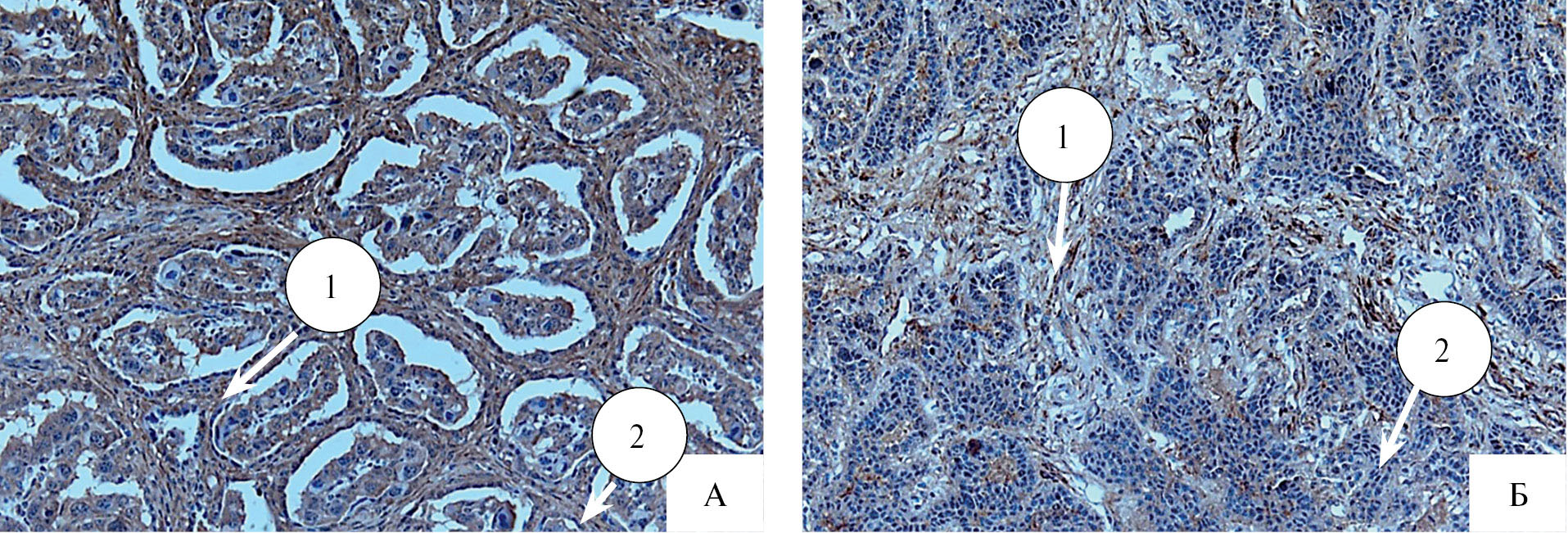 Рис. 3. Иммунолокализация ММР-2 пролиферации клеток плаценты ПАП-метод. А – нормальные роды: 1 – локализация ММР-2 в крипте; 2 – синцитиотрофобласте. Антитела к ММР-2. Б – задержание последа: 1 – локализация ММР-2 в энителиальных клетках крипт; 2 – криптах и ворсинах. Антитела к ММР-2.