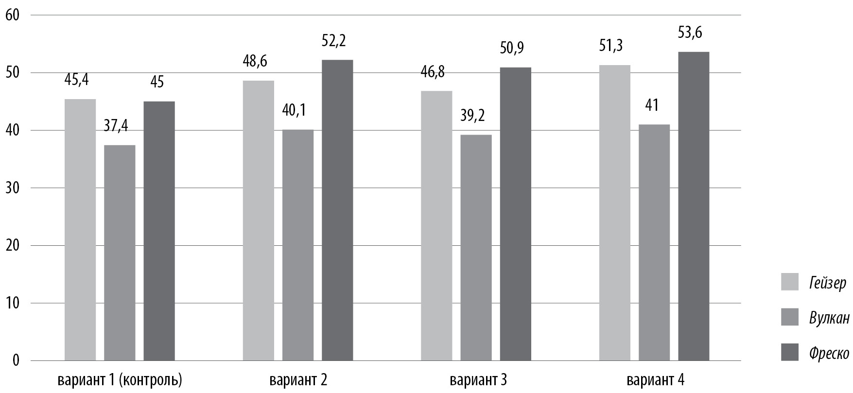 Максимальная площадь листовой поверхности в период цветения получена в четвертом варианте (посадка с прикатыванием почвы, гребнеобразование при уходе) и увеличилась к контролю у сортов: Фреско – на 8,6 тыс. м2/га (19,1%), Гейзер – 5,9 (13,0), Вулкан – 3,6 тыс. м2/га (9,6%). Площадь листовой поверхности у сорта Фреско была больше, чем у Гейзера и Вулкана на 2,3 и 12,6 тыс. м2/га соответственно (рис. 1).