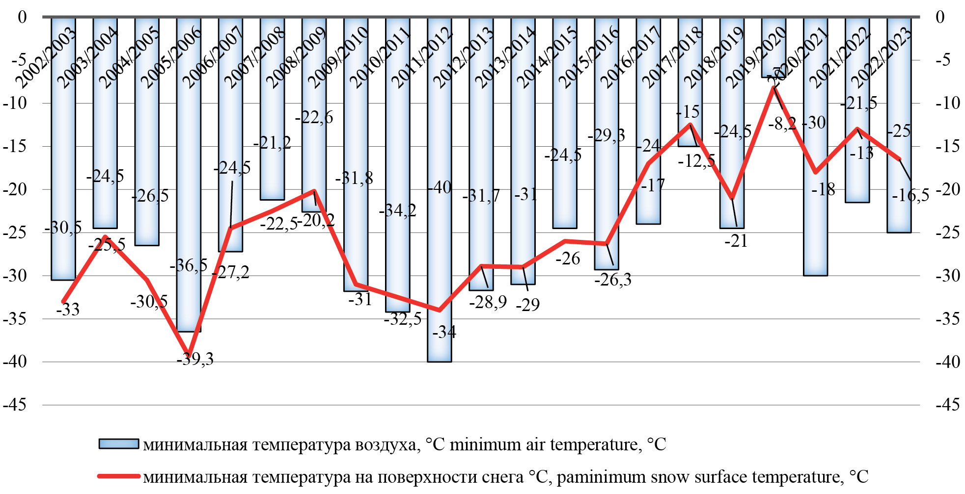 Рис. 1. Показатели минимальных температур воздуха и на поверхности снега, 2002–2023 годы.