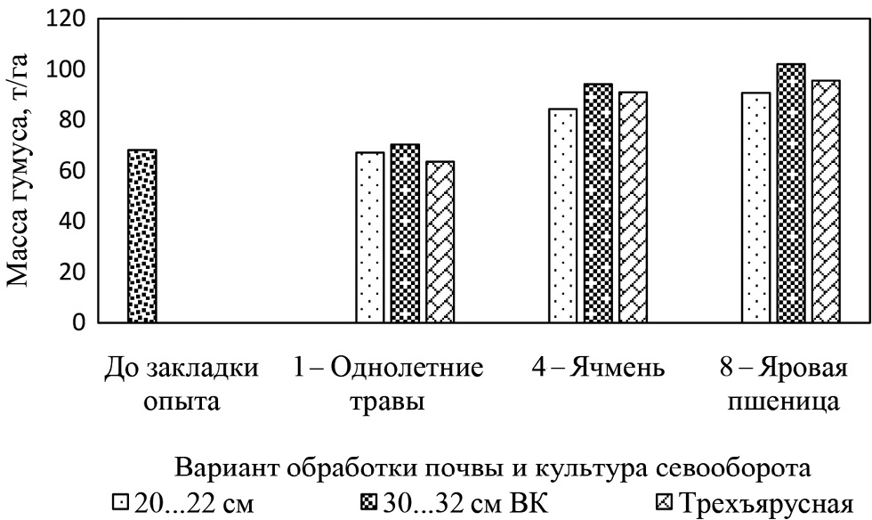 Во всех проведенных опытах общий баланс гумуса в севооборотах был положительным. Влияние обработки почвы на его динамику определяли способами и глубиной, интенсивностью воздействия на агрофизическое состояние пахотного и подпахотного слоев.