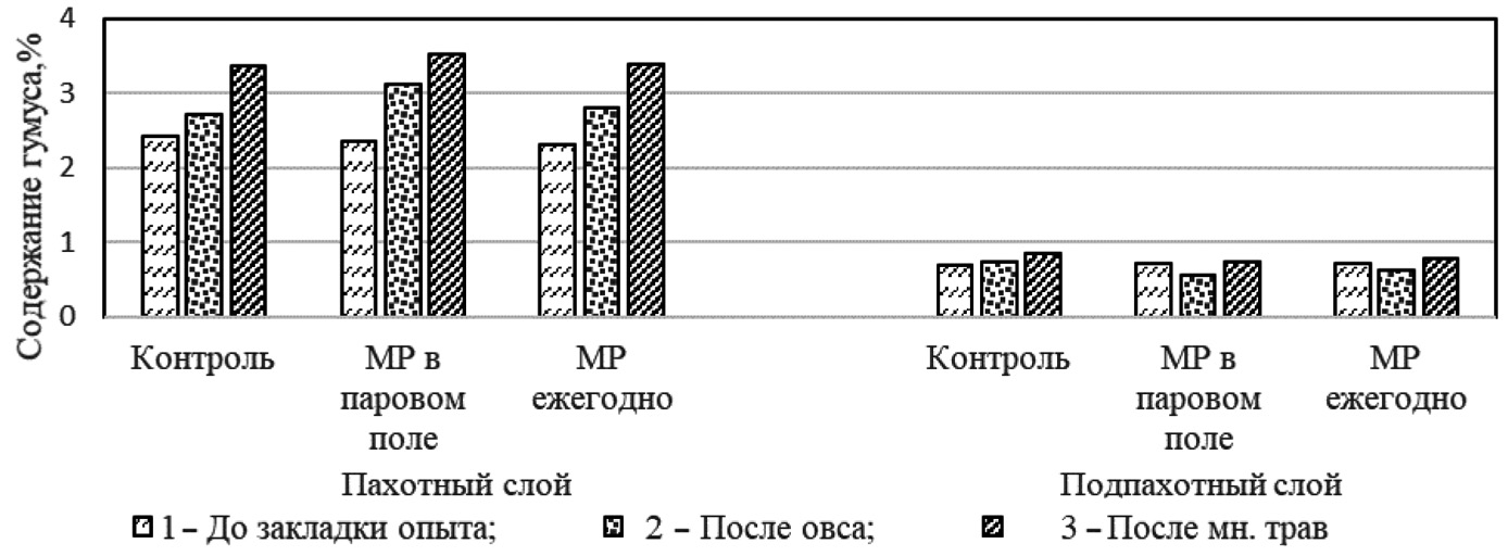Масса гумуса в пахотном слое при одноразовом проведении МР почвы выросла на 5,6 т/га. Положительные изменения в балансе гумуса связаны с увеличением количества растительных остатков, поступающих в почву, и благоприятными условиями для гумификации органического вещества (улучшение водно-воздушного режима). За шесть лет (без учета пласта трав) в варианте с МР в пахотный слой поступило 26,8 т/га растительных остатков, на 19,3% больше, по сравнению с контролем, после многолетних трав – 44,5%.