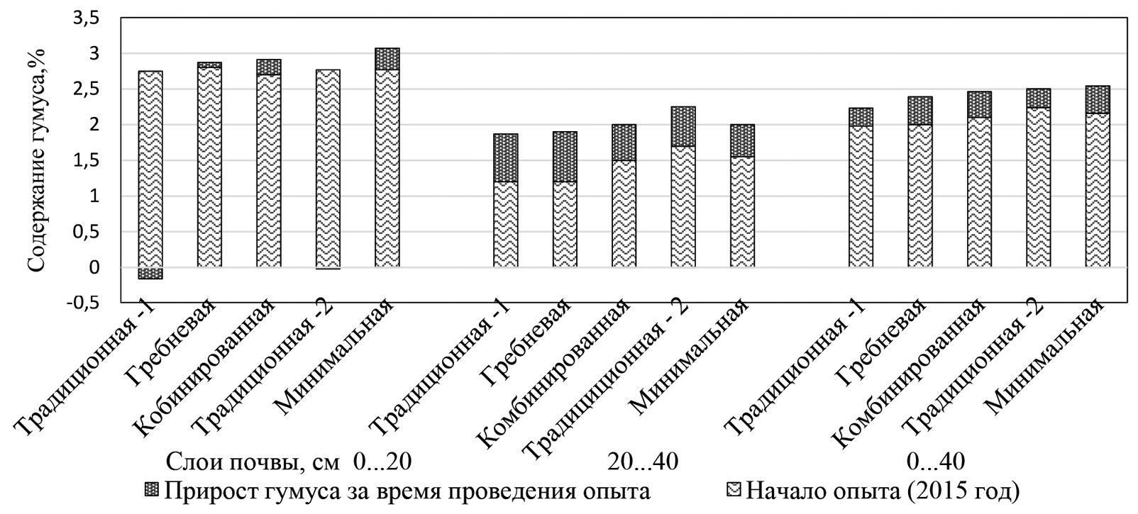 В слоях 0…40 и 20…40 см баланс гумуса был положительным во всех вариантах опыта. В подпахотном слое почвы содержание гумуса в контроле увеличилось на 0,67% (с 1,20 до 1,87%), 0…40 см – 0,25% (с 1,98 до 2,23%). При гребневой системе в подпахотном слое почвы изменения были аналогичными (рост на 0,70%). В слое 0…40 см содержание гумуса при гребневой системе из-за пахотного слоя выросло на 0,39…0,41%, это на 0,14…0,16% больше, чем в контроле.