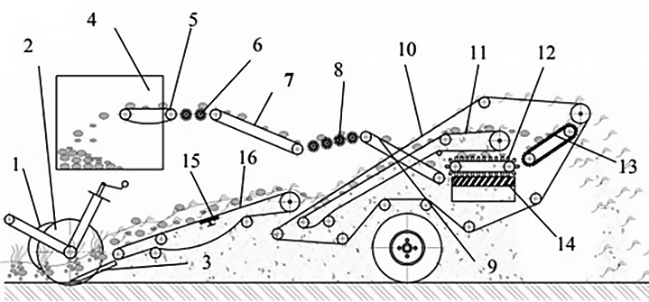 Рис. 1. Конструктивно-технологическая схема самоходного комбайна VARITRON 470 для уборки картофеля: 1 – катки; 2 – дисковые ножи; 3 – лемех; 4 – бункер; 5 – выгрузной транспортер; 6, 8 – отрывной валик; 7 – переборочный стол; 9 – подъемный транспортер; 10 – редкопрутковый транспортер; 11 – каскадный транспортер; 12 – щеточный сепаратор; 13 – горка; 14 – очесывающий валик; 15 – встряхиватель; 16 – основной транспортер.