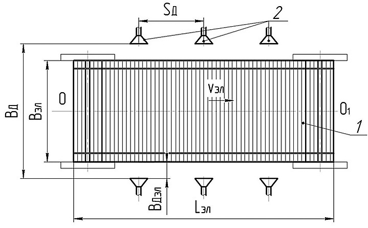 Межосевое расстояние SД между дефлекторами определяется необходимостью обеспечения равномерного обдува сепарирующей поверхности с постоянным температурным полем Т = const пруткового полотна, то есть требуется выполнение условия перекрытия тепловых потоков по всей длине LЭЛ сепарирующей поверхности (рис. 3).