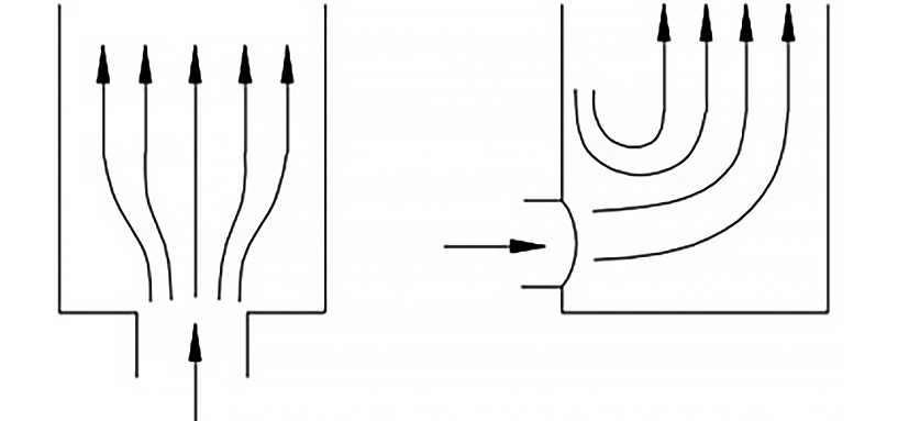 При центральном вводе (по оси аппарата) выхлопного газа за счет кинетической энергии входящей струи он движется преимущественно в центральной части аппарата, постепенно заполняя все сечение. При боковом – входящая газовая струя направляется к противоположной стенке и, ударяясь об нее, идет вверх.