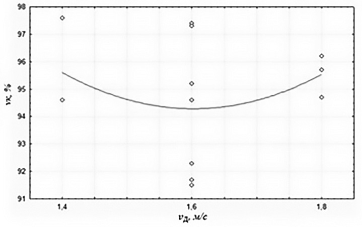 Увеличение поступательной скорости движения от 1,6 до 1,8 м/с повышает сепарирующую способность полотна от 94,8 до 95,9% в соответствии с эмпирической зависимостью (рис. 6):