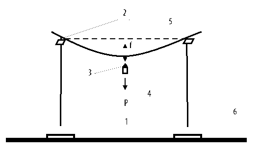 Рис. 1. Установка для определения прогиба пробы стебля: 1 – штативы; 2 – лапки; 3 – груз; 4 – проба стебля; 5 – нить; 6 – стол; f – прогиб пробы стебля в середине под действием силы Р.