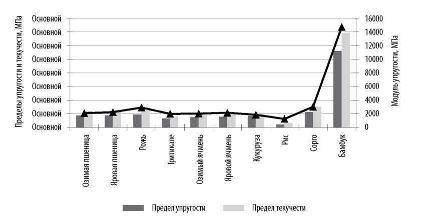 Модуль Юнга: для риса – 1250 МПа, кукурузы, тритикале, ячменя, пшеницы – 1865 … 2243, ржи и сорго – 2915 … 3022, бамбука – 14722 МПа. Для древесины бука – 12200 МПа, лиственницы – 14000 МПа, это в 14 раз меньше данного показателя для низкосортной стали (200000 МПа) (рис. 4). Пределы упругости для риса – 4,4 МПа, тритикале, ячменя, кукурузы, пшеницы – 13,3 … 17,7 ржи, сорго – 19,1 … 22,7, бамбука – 112,2 МПа. Для древесин бука – 95,3 МПа, лиственницы – 98,7 МПа, в 1,8 раза меньше этого показателя для низкосортной стали (200 МПа).