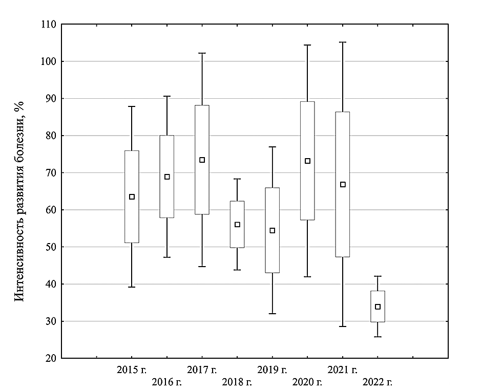 Методика. Работу выполняли в 2015–2022 гг. в Дальневосточном научно-исследовательском институте сельского хозяйства (Россия, Хабаровский край). Объект исследований – 84 образца яровой тритикале различного происхождения. Контроля устойчивости в опыте не было, так как в регионе не найдено сортов иммунных или устойчивых к заболеванию.