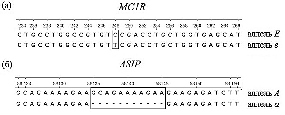 Вариации в генах MC1R и ASIP: а) миссенс-мутация в гене MC1R обозначена рамкой; б) позиция делеции 11 п. н. в гене ASIP обозначена рамкой (референсный геном EquCab3.0).