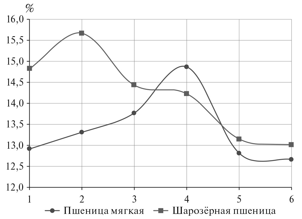 Рис. 2. Изменение содержания протеина в корме из колосьев пшениц разных видов в процессе созревания (НСР₀₅ по фактору культура – 0,83 %, фаза созревания – 0,75 %): 1–6 – фазы созревания зерна.