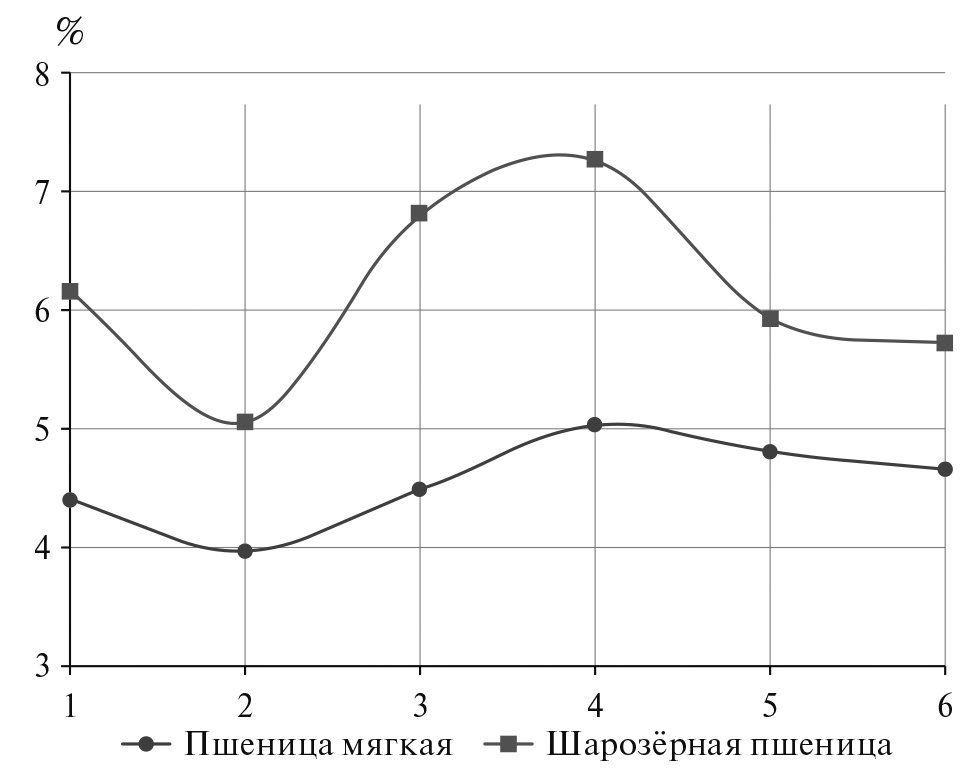 В колосьях мягкой пшеницы содержание протеина с начала созревания (12,91 %) постепенно достоверно возрастает на 1,95 %, достигая максимума 14,86 % в фазе середины восковой спелости, а затем резко снижается на 2,2 % до минимального уровня 12,66 % при полной спелости. Напротив, в корме из колосьев шарозерной пшеницы максимальное содержание протеина 15,66 % наблюдали в фазе тестообразной спелости, после чего оно достоверно снижается на 2,65 % до минимума 13,01 % при полной спелости. Величина этого показателя в корме из колосьев обеих культур, убранных в начале и середине восковой спелости, находится примерно на одном уровне.