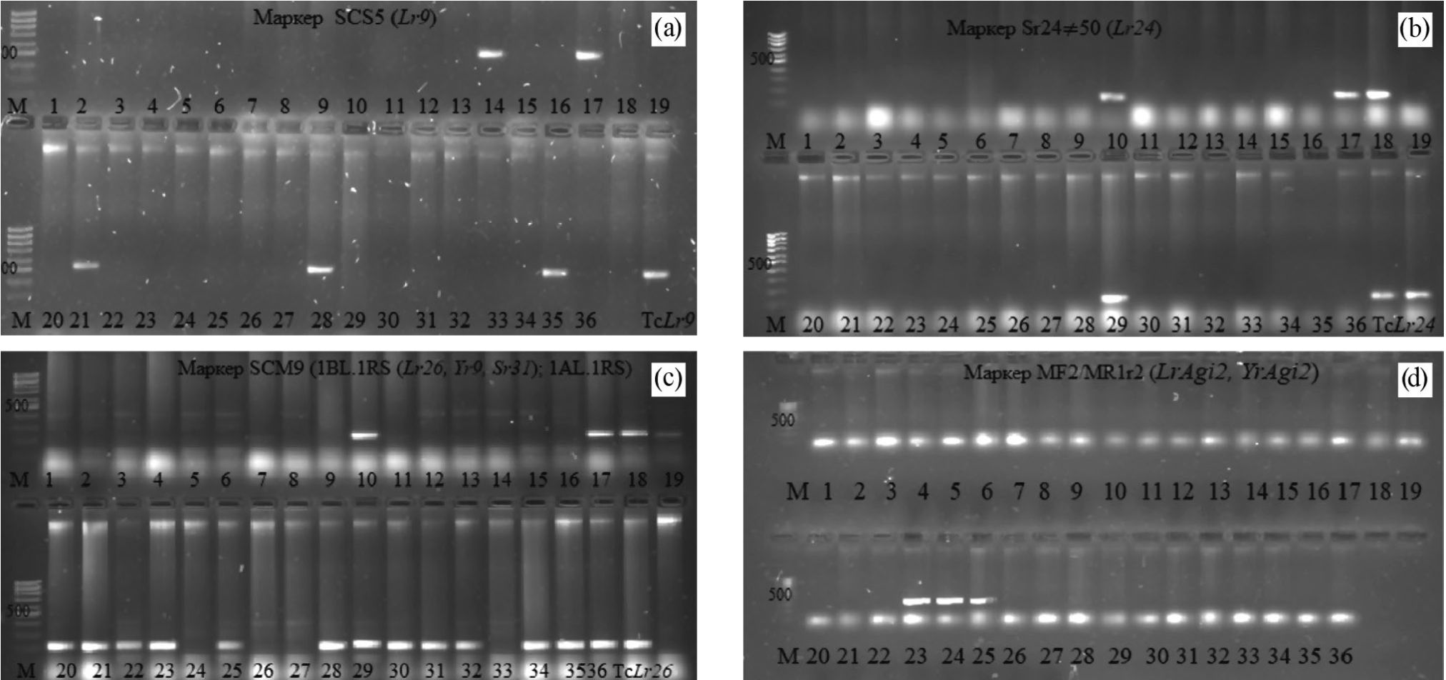 Электрофореграммы ПЦР образцов яровой пшеницы КАСИБ-22 с маркерами SCS5 (а), Sr24≠50 (b), SCM9 (c) и МF2/MR1r2 (d): М – маркер молекулярного веса (100bp, Диалат); 1…36 – образцы яровой пшеницы согласно перечню в табл. 1.