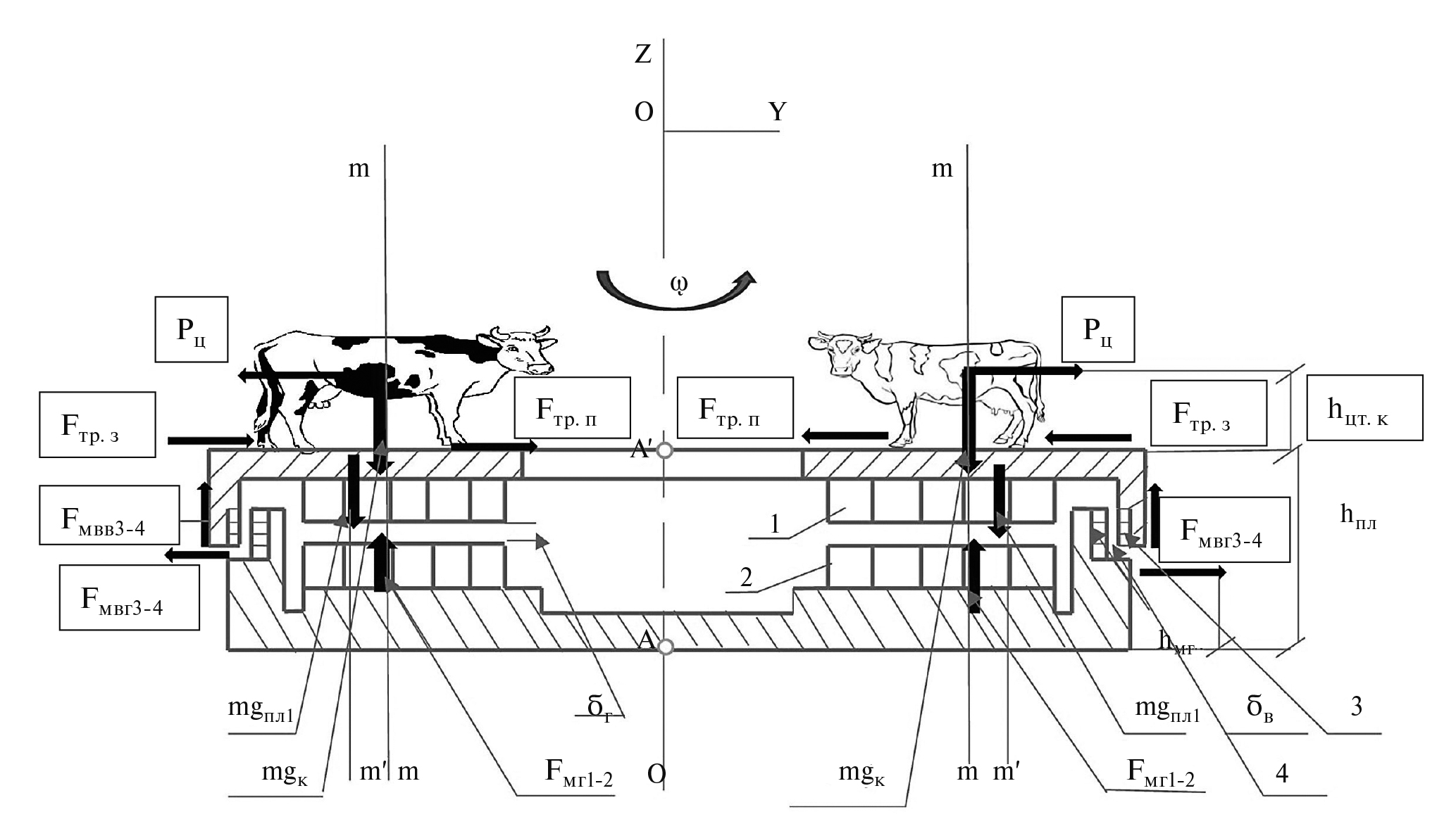 Рис. 2. Cхема cил, действующих на левитирующую доильную платформу Карусели с животными при ее полном заполнении: 1 – подвижная горизонтальная магнитная сборка левитации; 2 – неподвижная горизонтальная магнитная сборка левитации; 3 – подвижная вертикальная магнитная сборка боковой стабилизации; 4 – неподвижная вертикальная магнитная сборка боковой стабилизации; Rпл – радиус платформы, м; ϭг – воздушный левитационный зазор между горизонтальными магнитными сборками, м; ϭв – воздушный левитационный зазор между вертикальными магнитными сборками, м; hцт.к – расстояние от подвижной части платформы до центра тяжести животного по вертикали, м; hпл – высота платформы, м; Lоо-mm – расстояние от оси вращения платформы до центра тяжести животного по вертикали, м; lm-m΄ – расстояние от центра тяжести животного до центра тяжести доильного места платформы по вертикали, м; h мг – расстояние от нижнего основания платформы до боковой вертикальной магнитной сборки (3–4); точка «А» находится на оси вращения платформы О-О.