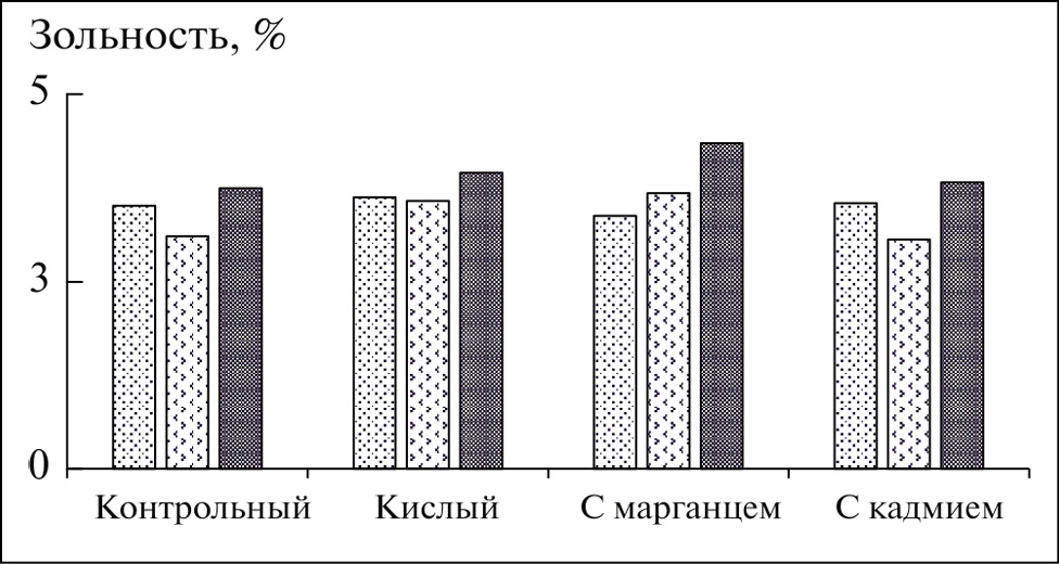 Продуктивность овса оценивали по массе зерна с одного растения. Зерно после учета измельчали, пропускали через сито с диаметром отверстий 1 мм. Содержание кадмия и марганца в зерне определяли методом атомно-абсорбционной спектроскопии на приборе «СПЕКТР-5-4» (Россия, «СоюзЦМА»). Предварительная подготовка проб зерна для исследования на тяжелые металлы заключалась в сухой минерализации и последующем переводе золы в раствор соляной кислотой. Для каждой пробы по результатам сухой минерализации рассчитывали зольность [30, 31]. Все измерения проводили в трех аналитических повторностях.