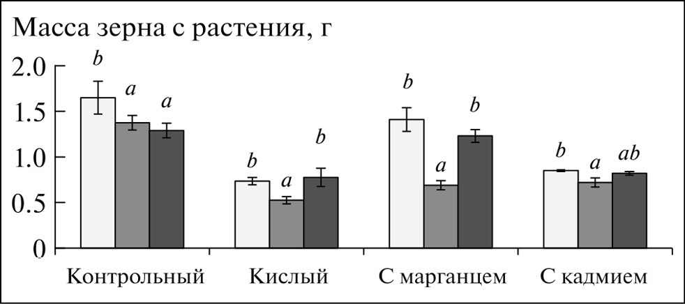 Продуктивность, определяемая по показателю массы зерна с 1 растения, на контрольном фоне варьировала от 1,3 до 1,7 г; на кислом – от 0,5 до 0,8 г; с избытком марганца – от 0,7 до 1,4 г; с избытком кадмия – от 0,7 до 0,9 г (рис. 5). Если в благоприятных (контрольных) условиях величина этого показателя у регенерантов (1,29 ± 0,08 г) и исходной линии (1,38 ± 0,08 г) была существенно ниже, чем у стандарта (1,65 ± 0,18 г), то на жестких стрессовых фонах у всех генотипов она достоверно снижалась относительно контроля: при повышенной кислотности и избытке кадмия – у стандарта в 2,3 и 1,9 раза соответственно, исходной линии – в 2,6 и 1,9 раза, регенерантов (RAAl и RACd) – в 1,7 и 1,6 раза. Следует отметить, что в этих же условиях масса зерна с растения у стандарта, RAAl и RACd достоверно не различалась и была выше, чем у исходной линии в 1,5 и 1,2 раза соответственно. На присутствие избыточного марганца в почве негативно реагировала только исходная линия – наблюдали снижение продуктивности в 2 раза, по сравнению с контролем; а также в 2,1 и 1,8 раза, по сравнению со стандартом и регенерантом (RAMn) cсоответственно.