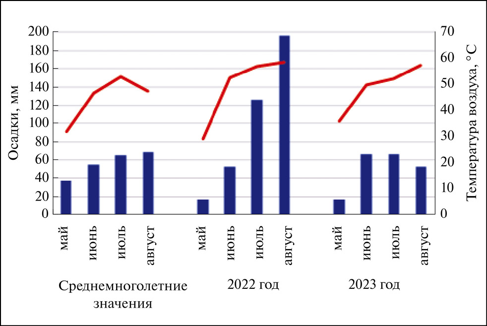 Вегетационный период 2022 г. характеризовался нетипичными погодными условиями – температура воздуха была незначительно выше среднемноголетней, но при этом отмечали выпадение большого количества осадков (на 40 % выше, по сравнению со среднемноголетним). Метеоусловия 2023 г. в целом не отличались от среднемноголетних, однако в начале летнего периода температура воздуха была пониженной (рис. 1).