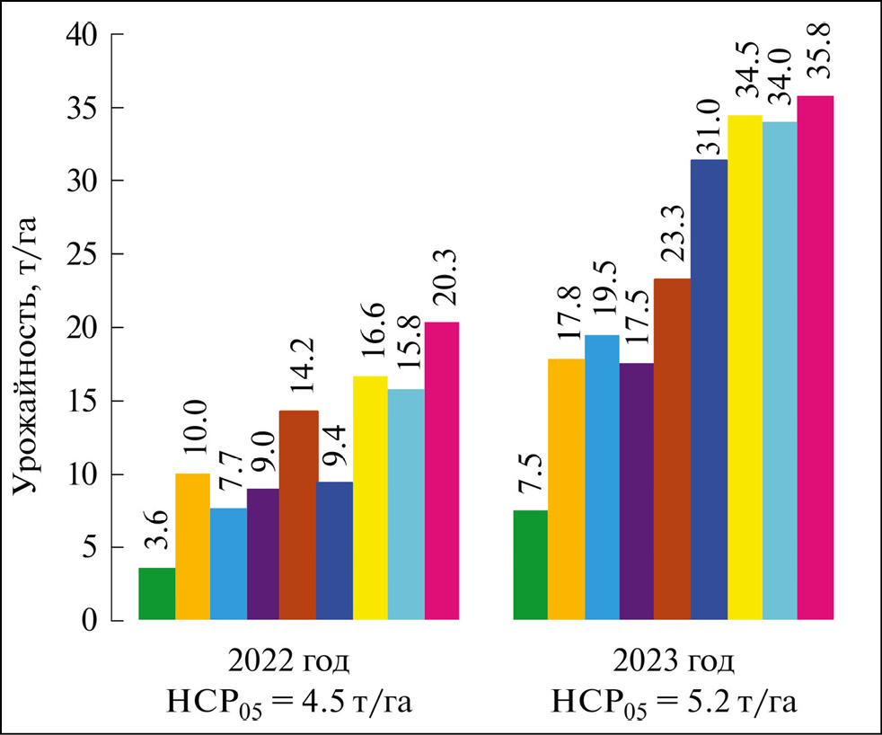 Рис. 4. Урожайность картофеля сорта Лига после применения гербицидов в чистом виде и их баковой смеси (2022–2023 гг.), т/га: – контроль; – Некус, ВР – 1.0 л/га; – Некус, ВР – 1.25 л/га; – Трейсер, КЭ – 0.25 л/га; – Трейсер, КЭ – 0.5 л/га; – Некус, ВР + Трейсер, КЭ – 1.0 л/га+0.25 л/га; – Некус, ВР + Трейсер, КЭ – 1.0 л/га+0.5 л/га; – Некус, ВР + Трейсер, КЭ – 1.25 л/га+0.25 л/га; – Некус, ВР + Трейсер, КЭ – 1.25 л/га+0.5 л/га.